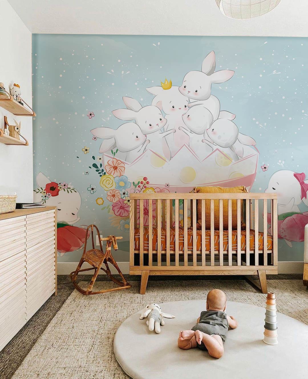 Sentez le duveteux et l'amour avec nos lapins de collection de fonds muraux. Le bébé bleu en arrière-plan lui donne un thème brillant qui rend la pièce plus grande. Le design est tellement parfait pour un Nouvelle-née Room Styling, and Aussi pour les filles. Il sera également parfait pour une pépinière. La palette des couleurs est si lite et vue confortable qui fait des contrats calmes et un thème simple qui correspond aux premières étapes du bébé introduites aux couleurs. N'oubliez pas de compléter le look complet avec des décorations lite, alors ajoutez des rideaux en mousseline blanc et du tapis moelleux pour une jolie vue totale.