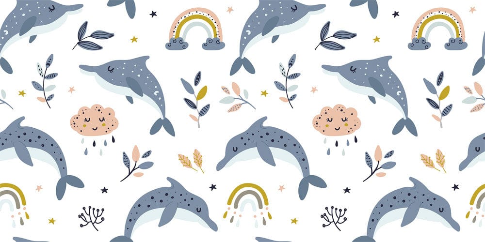 Transportez la magie de l'océan dans votre maison avec ce papier peint mural Dolphin Dream. Ce papier peint ludique pour enfants représente un joyeux dauphin de dessin animé entouré de nuages colorés, d'arcs-en-ciel, de feuilles et même de gouttes de pluie. Ce design est un choix idéal pour la chambre de vos enfants ou la salle de jeux, et il est également parfait pour tout endroit où vous souhaitez rendre les gens heureux en ajoutant de la vie et de la joie. La peinture murale est faite d'un matériau en toile qui crée l'aspect d'une peinture murale sur votre mur, de sorte que vous pouvez avoir de la joie pour votre espace de vie avec ce motif relaxant.
