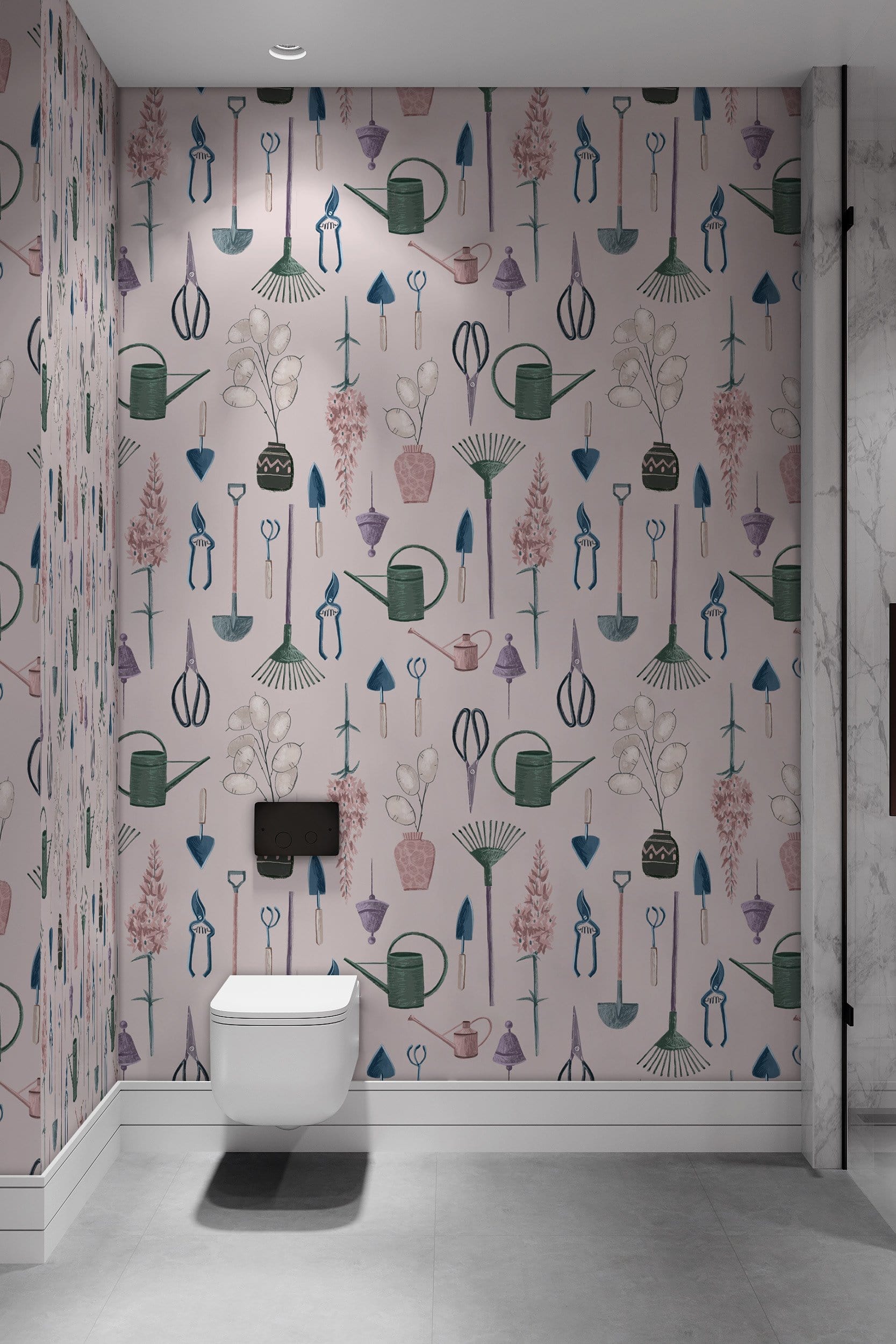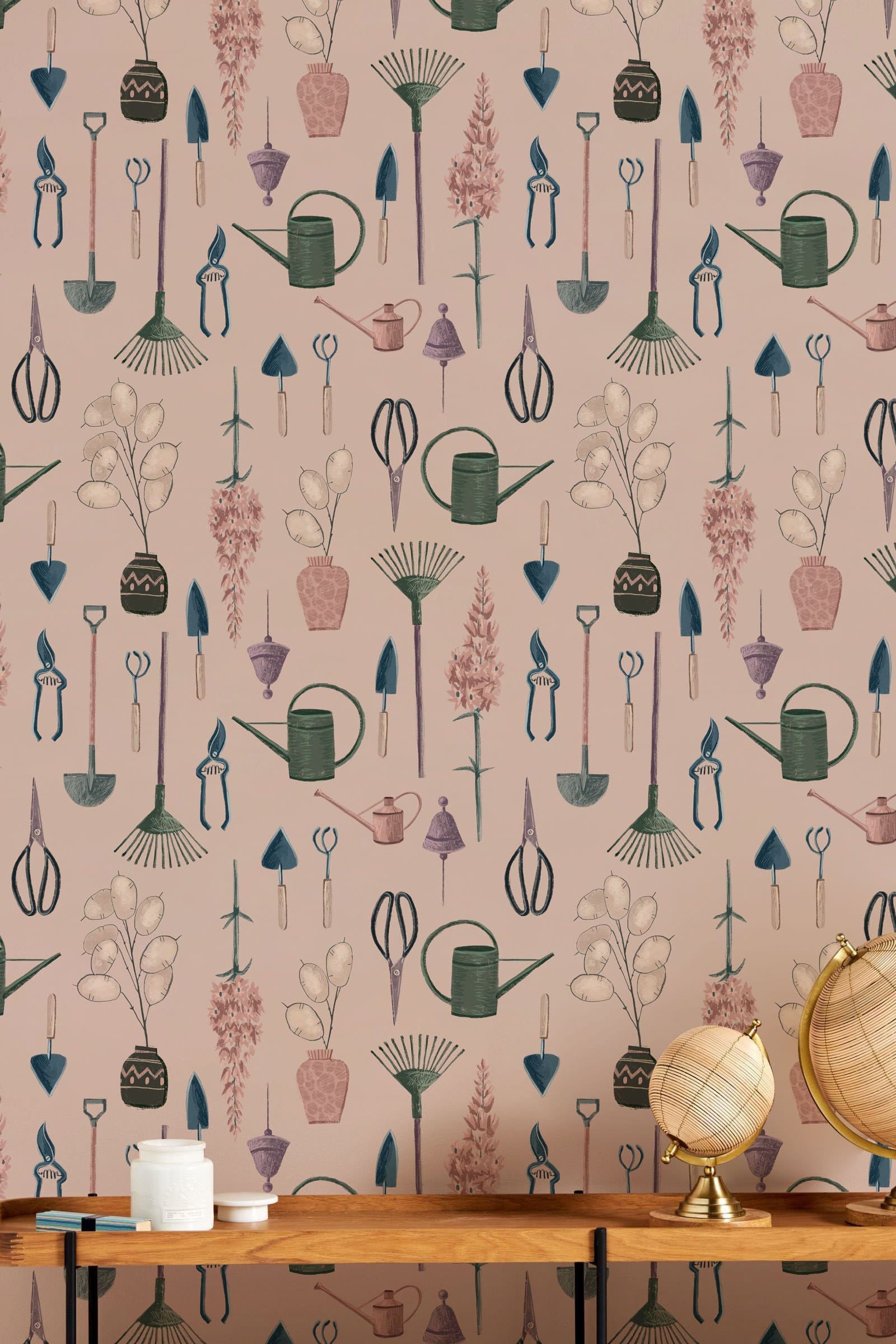 Si vous aimez les fleurs, les plantes et le jardinage, alors cette murale de papier peint est pour vous! Ce papier peint avec des outils importants dont vous avez besoin pour votre jardinage tel que l'arrosage de la casserole, des ciseaux et de la pelle sous le fond du rose pastel. Créez un espace élégant et charmant avec ce papier peint distinctif dans votre chambre.