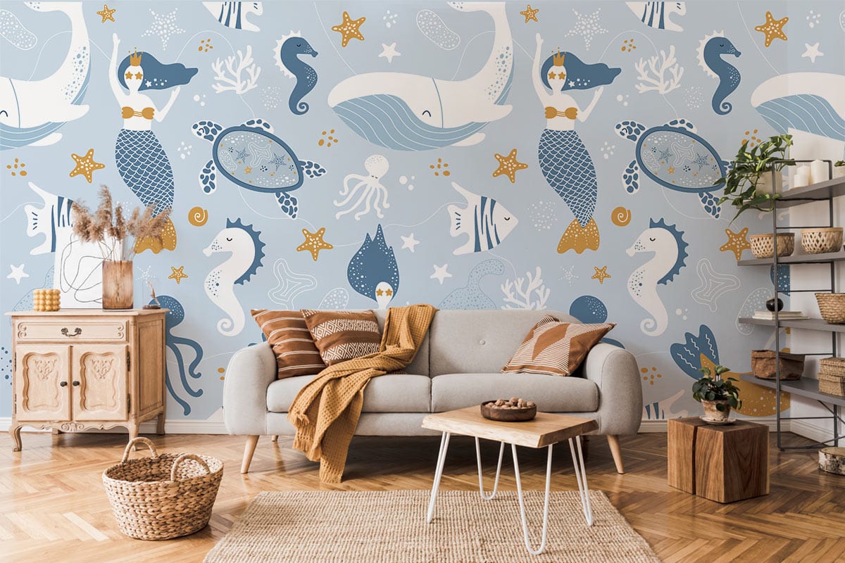 C'est un océan bleu avec des sirènes et des amis de l'océan. La couleur joyeuse peut vous amener dans un monde heureux de l'océan. Les sirènes qui dansent et les joyeux amis de l'océan feront de votre maison un endroit sans désagrément. Appréciez le sentiment de bonheur et de simplicité. Ce papier peint panoramique conviendra aux enfants, aux adolescents et à tous ceux qui aiment le monde de l'océan.