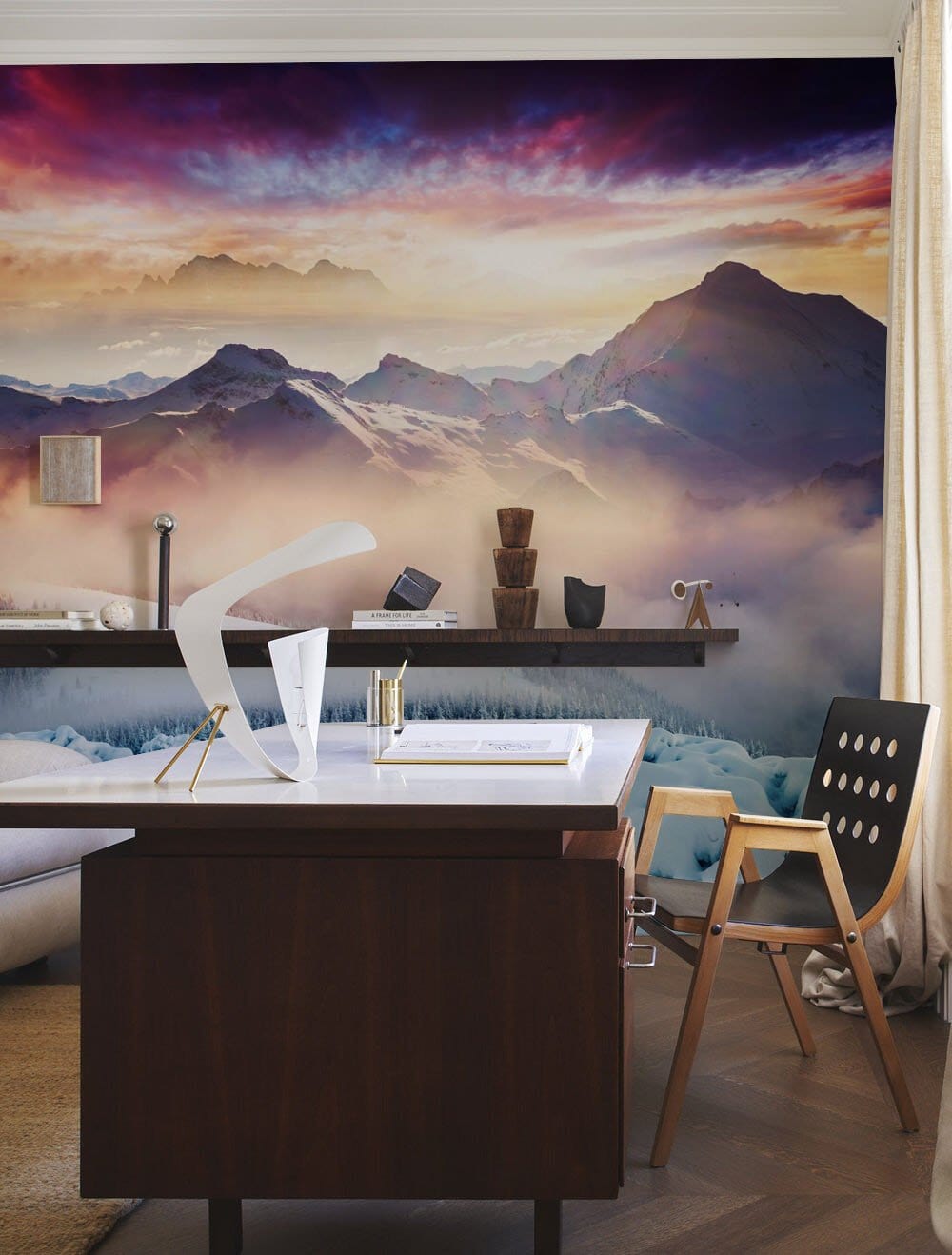 Profitez de ce coucher de soleil du soir au sommet de la montagne après la peinture murale de papier peint de neige. Créez un mur de fonctionnalité incroyable dans vos intérieurs avec cette magnifique fresque murale des majestueuses chaînes de montagnes inondées de ciel coloré et des pics rocheux enneigés. Associez-le au mobilier moderne de votre choix.