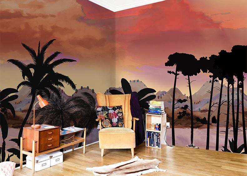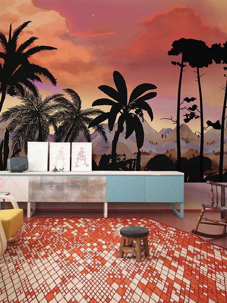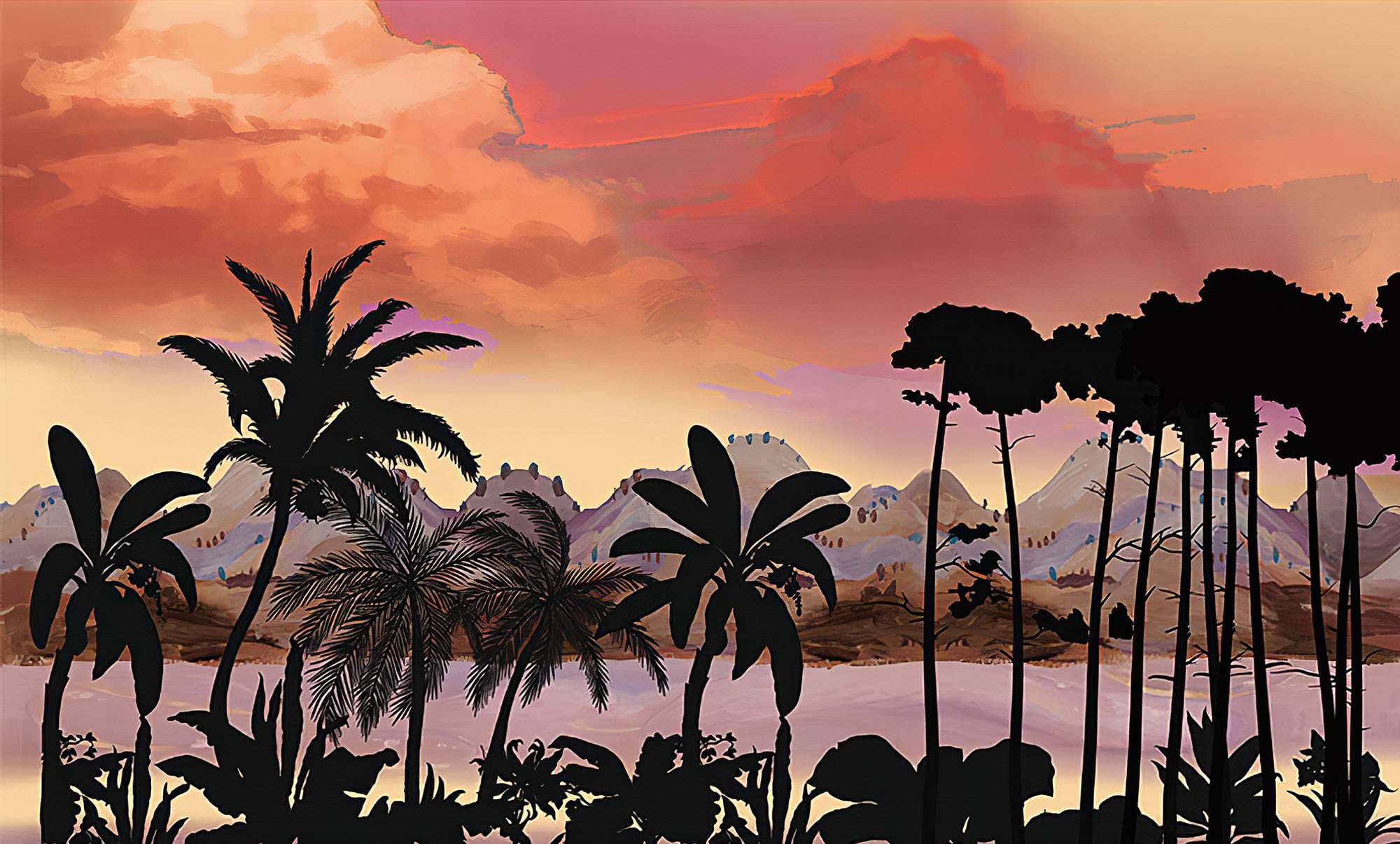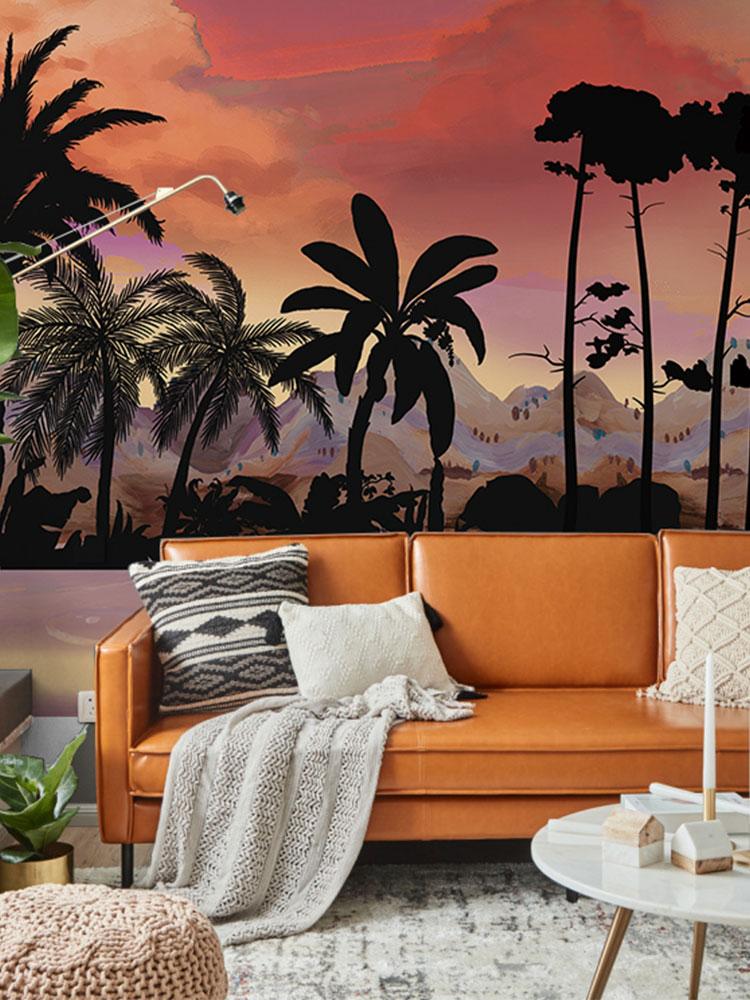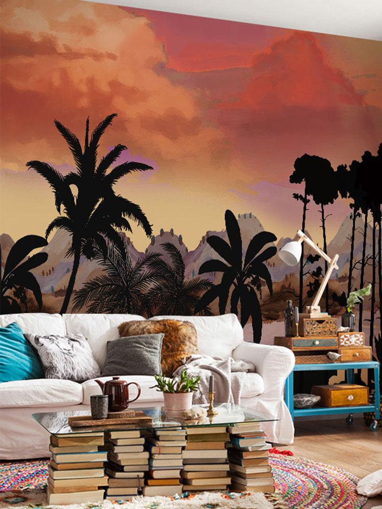 Détendez-vous dans ce magnifique coucher de soleil sur la plage sous les palmiers. Le coucher de soleil orange vif, les montagnes gris pastel contrastant avec les palmiers sombres vous procureront un impact visuel fort mais confortable. Papier peint paysage idéal pour votre salon et votre salle à manger. Associez-le à vos meubles en bois ou blancs, ce sera génial.