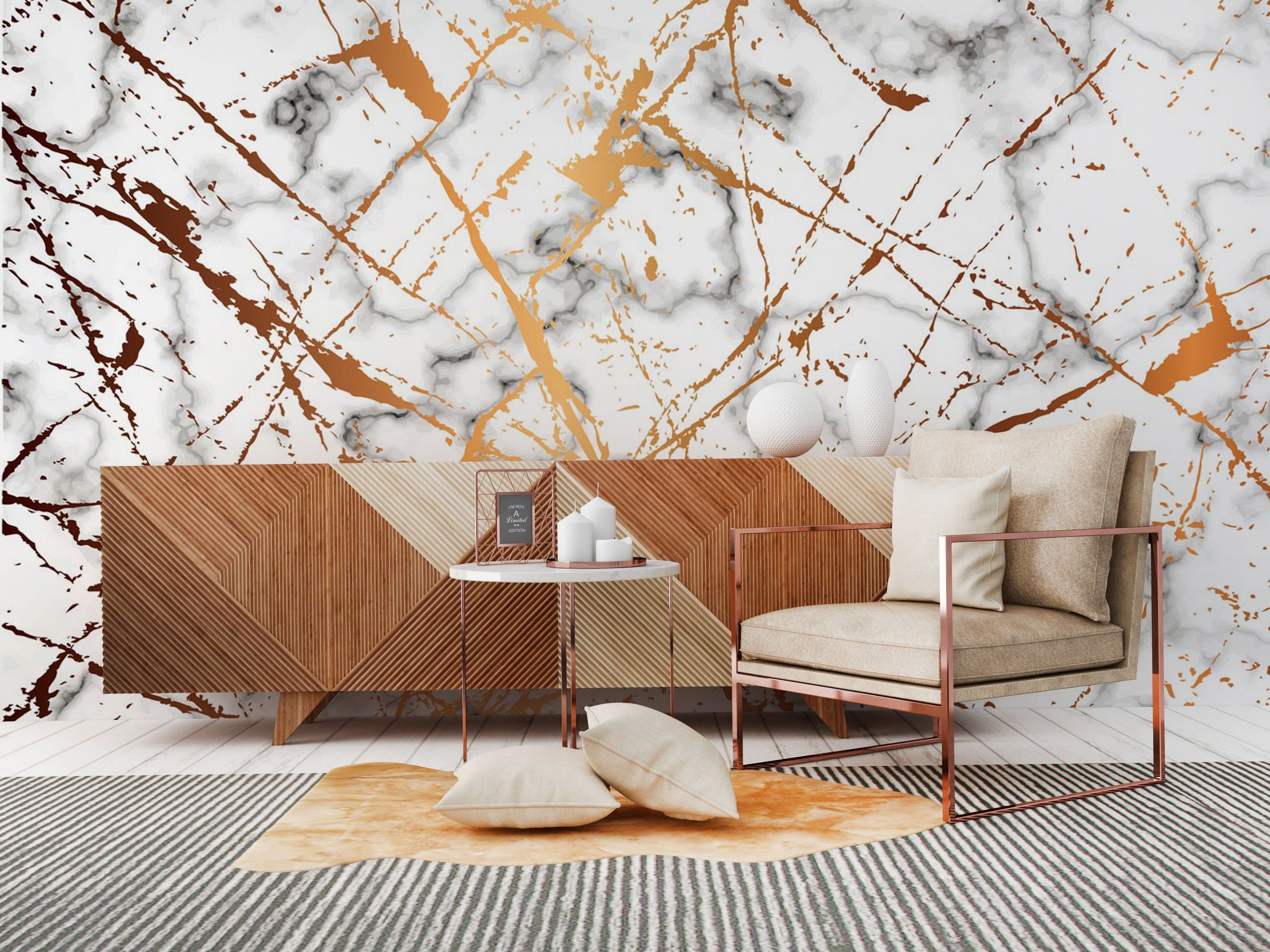 Apportez une finition élégante à votre intérieur avec ce papier peint effet carreaux de marbre, un design à effet mural frais qui impressionnera. Doté de griffonnages dorés avec des carreaux de marbre blancs élégants mis à l'échelle à partir du bas, ce design unique ajoutera à coup sûr un élément accrocheur à votre thème. La texture fraîche du marbre blanc offre un style contemporain parfait pour les cuisines modernes, les salles de bains et plus encore.