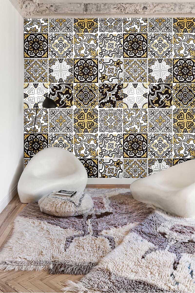 accueille la fresque murale de carreaux floraux dans votre espace et créez un style de maison moderne. Ce papier peint de texture d'art floral est conçu en noir, jaune et gris sous un fond de ton blanc, qui correspond parfait à n'importe quelle pièce avec des meubles sophistiqués, modernes ou contemporains. Disponible en Peel & amp; Type de papier et de papier permanent avec encres en famille. Préparez-vous pour un design d'intérieur magnifique!