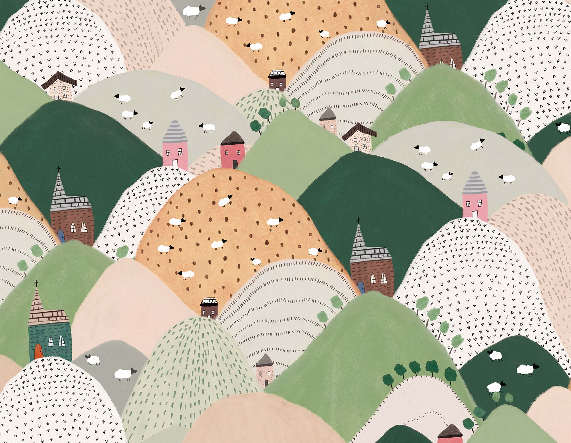 Inondez vos murs avec ce papier peint de collines verdoyantes. Cette conception répétitive de colline de montagne dans différentes couleurs et styles de peinture réjouira instantanément vos yeux fatigués. Alors allez-y et mettez en valeur un mur dans la chambre de votre enfant avec ce joli design qui met en valeur votre penchant pour la nature en abondance. Associez-le à n'importe quel meuble de couleur vive dans la chambre de votre enfant.
