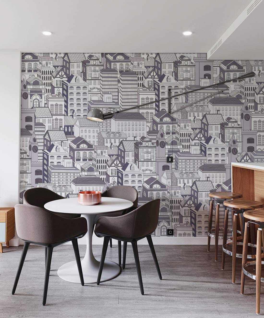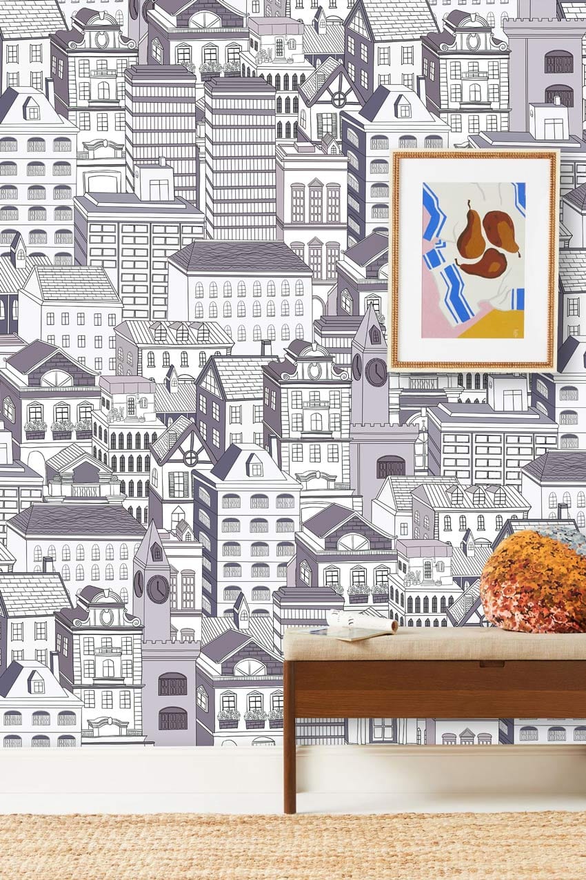 Apportez une ambiance spectaculaire à votre espace avec cette ligne de dessin de ligne et des bâtiments portrait du papier peint mural. L'œuvre créée en violet & amp; White apporte la simplicité et le lieu moderne au design. Utilisez-le comme mur de caractéristiques dans votre chambre avec des meubles de votre choix car les décors blancs sont parfaits à s'associer à toute la décoration de la maison.