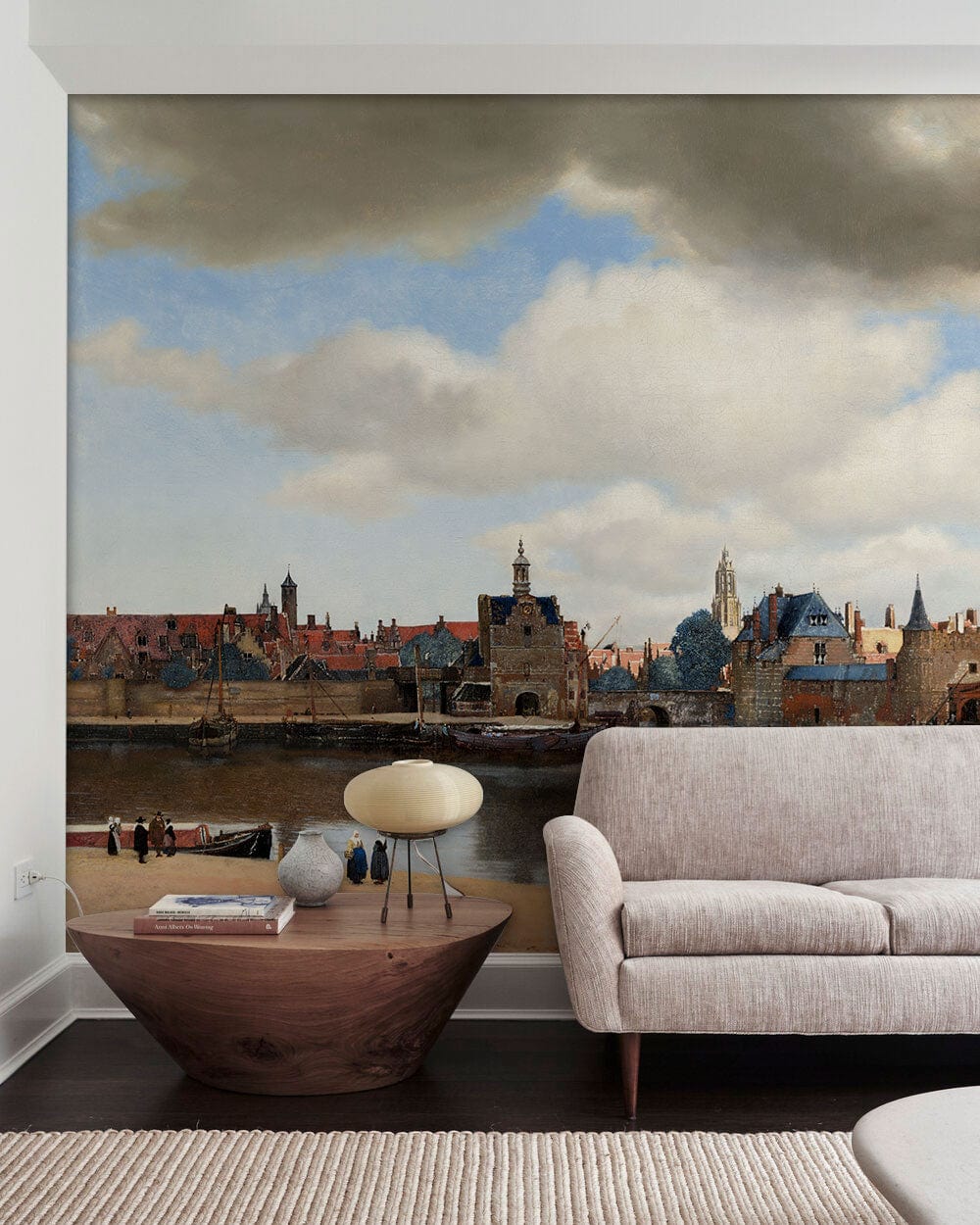Ce fond d'écran mural View of Delft présente une peinture de la ville de Delft, un paysage hollandais traditionnel inspiré de l'une des œuvres les plus célèbres de la peinture néerlandaise de l'âge d'or du XVIIe siècle. Ce paysage urbain classique et célèbre est une représentation idyllique de canaux, de ponts et de vieux bâtiments baignés par la lumière du soleil. La vue donne sur la Tamise et sur un ciel bleu entouré de bâtiments et de navires, ce qui rend compte de l'état actuel de ce charmant centre-ville et de ses environs. Ce papier peint mural convient parfaitement aux maisons à thème vintage.